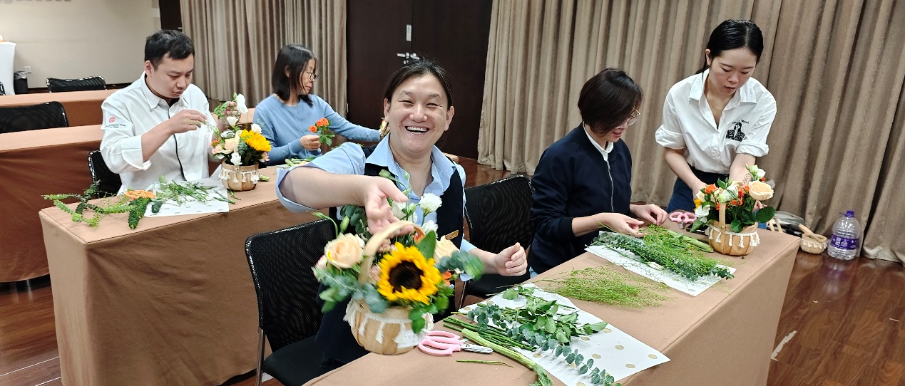 本次活动为大家精心准备了各种花材,花香洋溢在室内每个角落。花艺老师向大家细致介绍了各类花型和插花表达的意境,并亲手示范多种造型的插花,将插花艺术生动地展现在员工们面前。在老师的指导下,大家从选材、搭配到修剪、装饰,充分展示各自的审美,制作出一束束生机盎然的花艺作品。