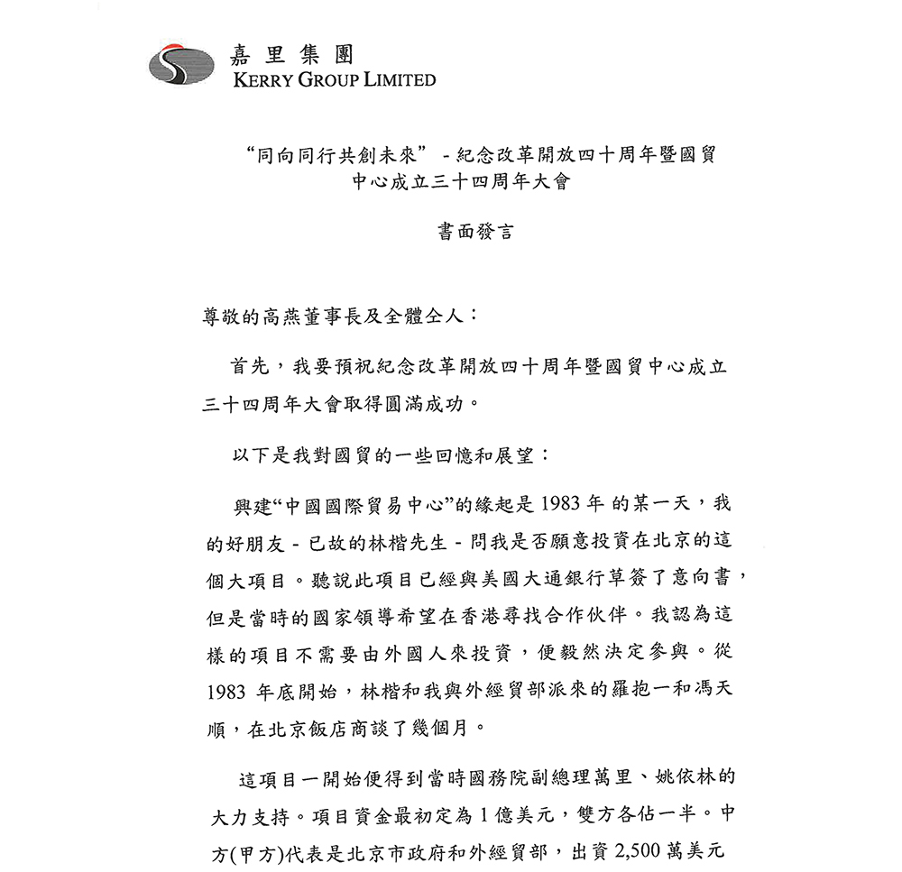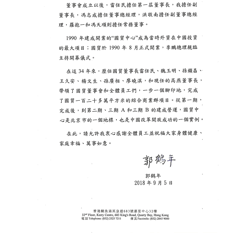 郭鹤年先生为大会发来贺信