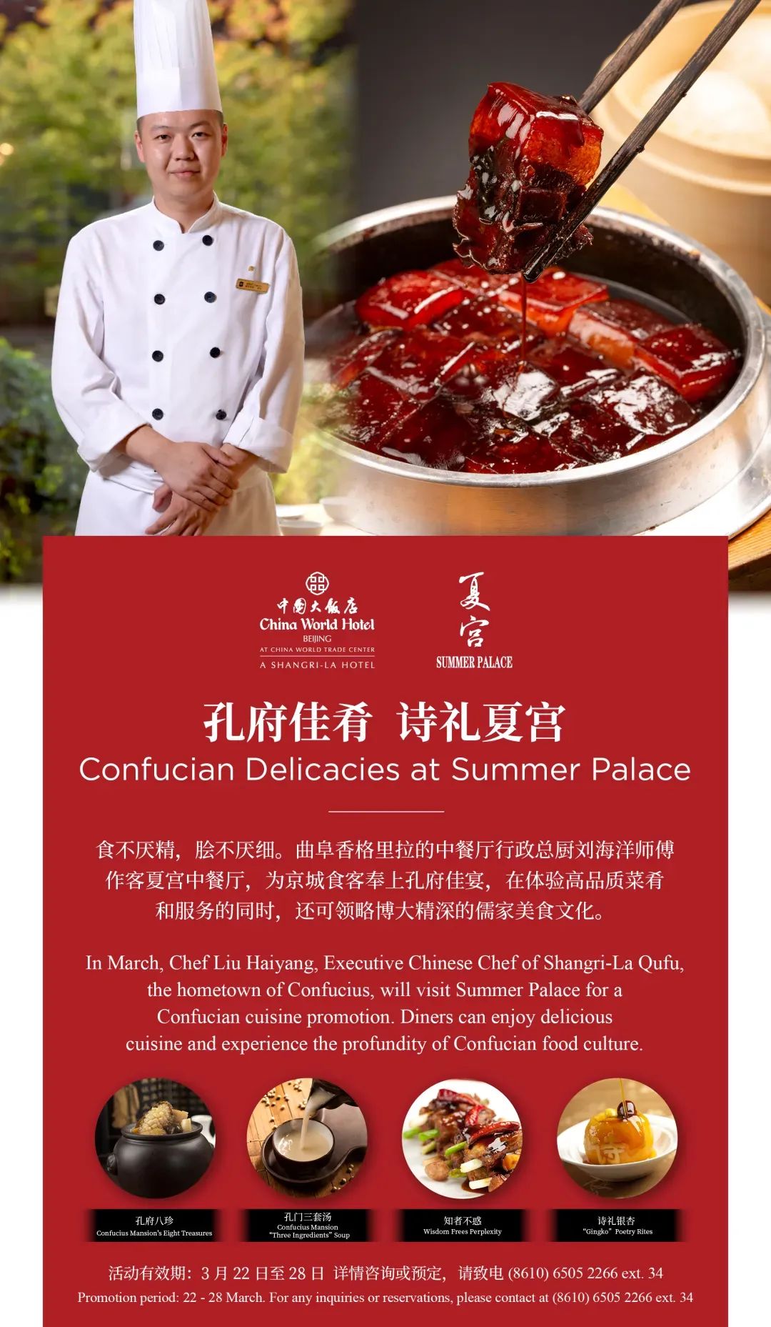 食不厌精,脍不厌细。曲阜香格里拉的中餐厅行政总厨刘海洋师傅作客夏宫中餐厅,为京城食客奉上孔府佳宴,在体验高品质菜肴和服务的同时,还可领略博大精深的儒家美食文化。